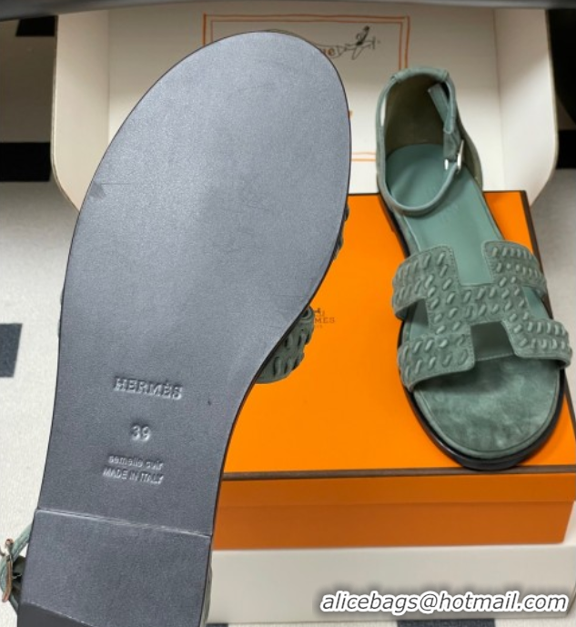Pretty Style Hermes Santorini Flat Sandals in Braided Suede Green 1023087