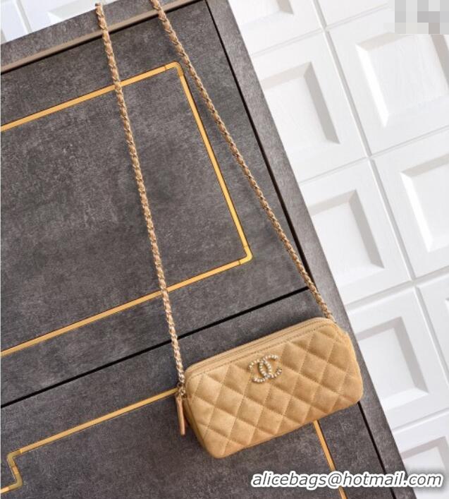Luxury Classic Chanel Suede Zipped Phone Holder with Chain and Strass CH101102 Brown 2025