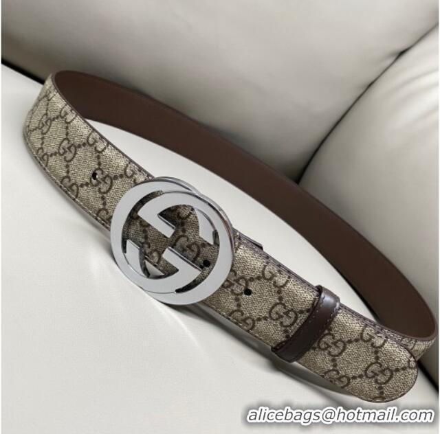 Promotional Gucci GG Supreme Canvas Belt 4cm with Silver Interlocking G Buckle GG011002 Beige/Brown 2025
