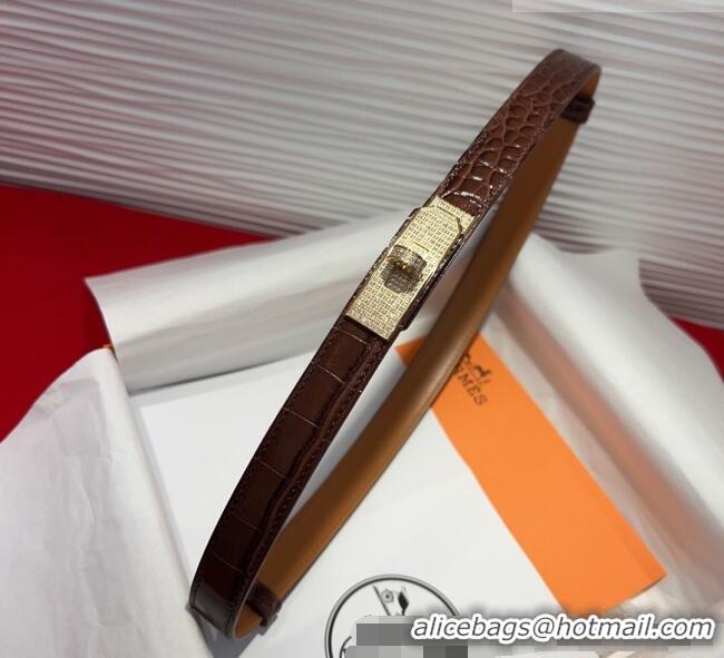 Promotional Hermes Kelly Duo Belt 1.8cm in Crocodile Embossed Calfskin with Gold Strass Paved Buckle H2011025 Dark Brown