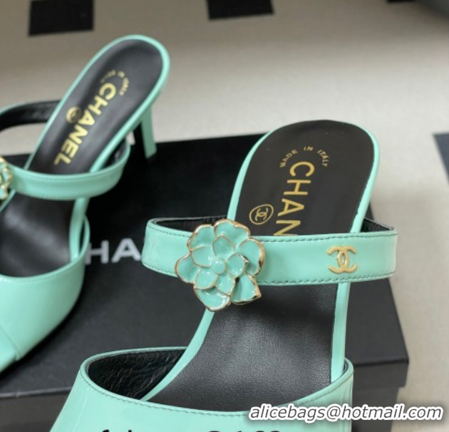 Charming Chanel Patent Calfskin Leather Heel Slides Sandal 7.5cm with Camellia CH030613 Green 2026