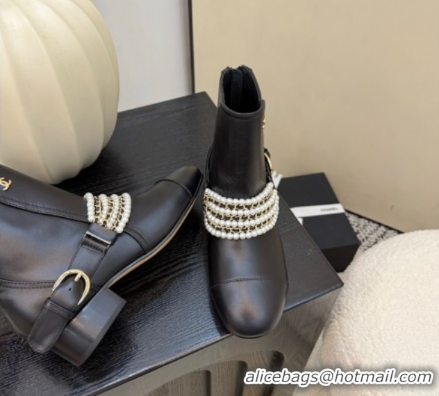 Good Quality Chanel Calfskin Leather Ankle Boots with Pearls Black 2025 CH110408 1104046