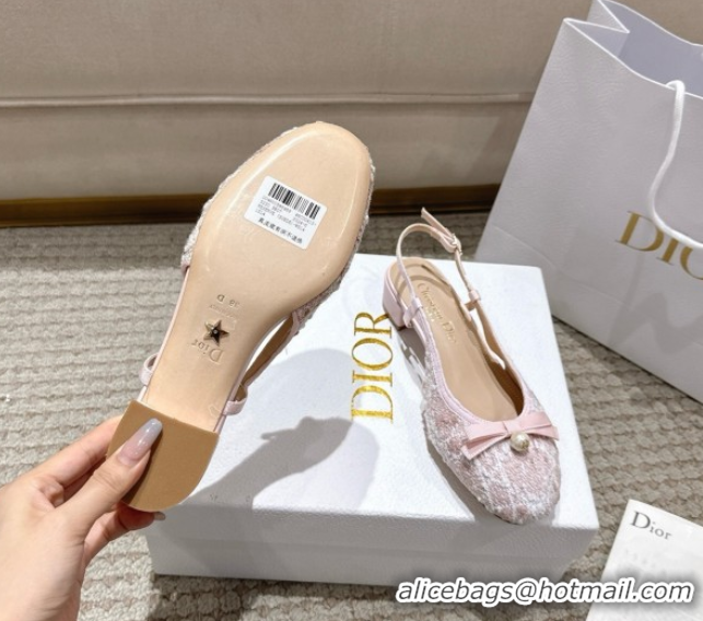 Top Grade Dior Ballet Slingback Pumps 3cm in Quilted Cannage Tweed with Pearl Bow Pink 0822015