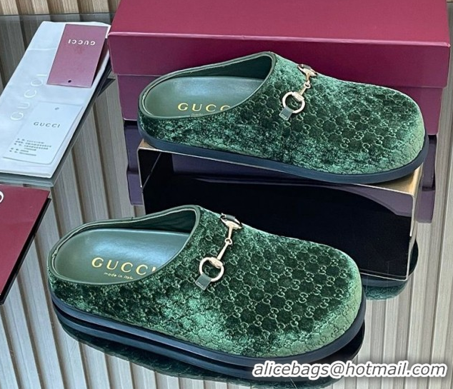 Good Quality Gucci GG Velvet Flat Mules with Horsebit Dark Green 836057 1020019
