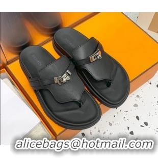Good Product Hermes Kelly Leather Flat Thong Sandals Black 072808