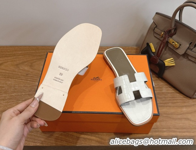 Charming Hermes Oran Classic Flat Slides Sandal in Crocodile Embossed Leather White 0304065