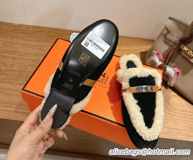 > Shoes Plaza > Hermes Shoes > Low Price Hermes Oz Flat Loafers in Suede and Shearling with Kelly Buckle Black 1023012