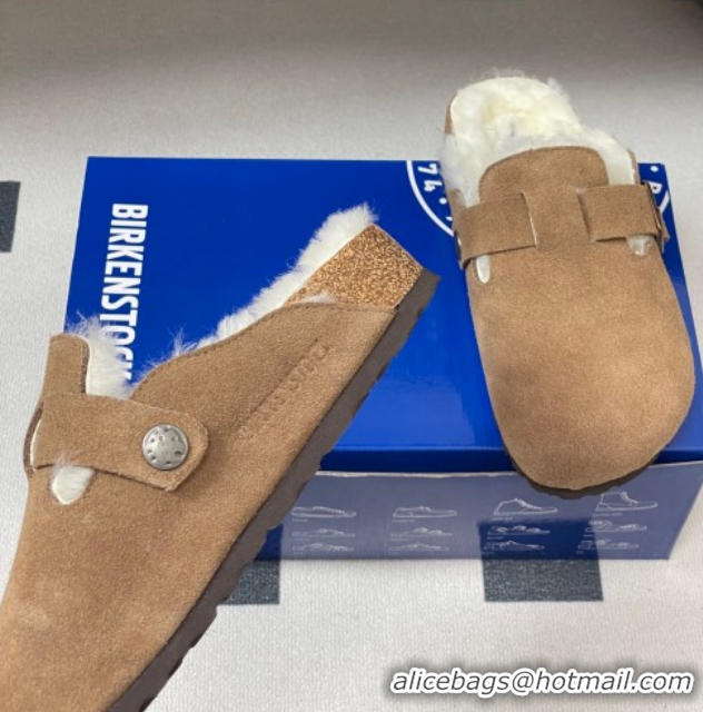 > Shoes Plaza > Louis Vuitton Shoes > Sumptuous Louis Vuitton x Birkenstock Flat Mules with Buckle Strap in Suede and Wool Light Brown 1022116