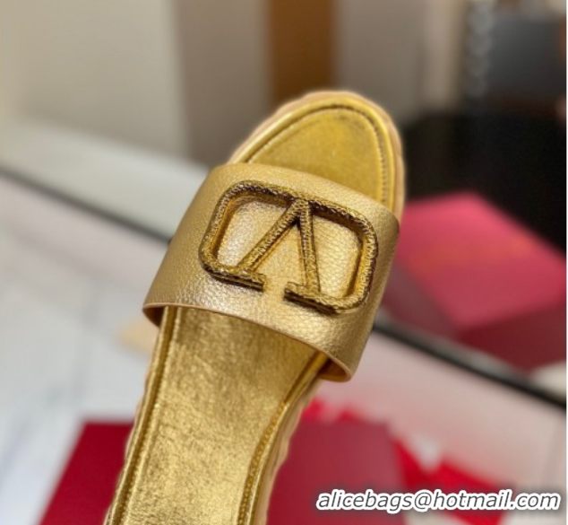 Top Design Valentino VLogo Grainy Calfskin Flat Slides Sandal Gold-Tone 2025 VA082114 0821136