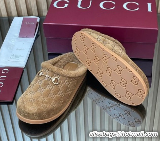 Classic Practical Gucci GG Suede and Wool Flat Mules with Horsebit Brown 836057 1020005