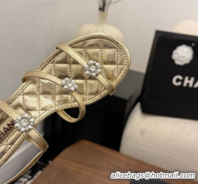 Shop Duplicate Chanel Lambskin Leather Low Heel Strap Sandals with Bloom G46964 Gold 2026