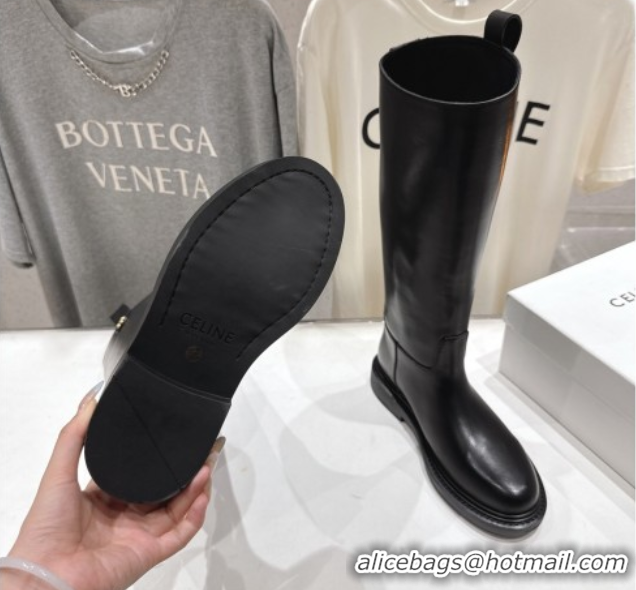 Cheap Price Celine Flat High Boots in Waxed Calfskin Leather with Triomphe Logo Strap Black 2025 CE102403 1024052
