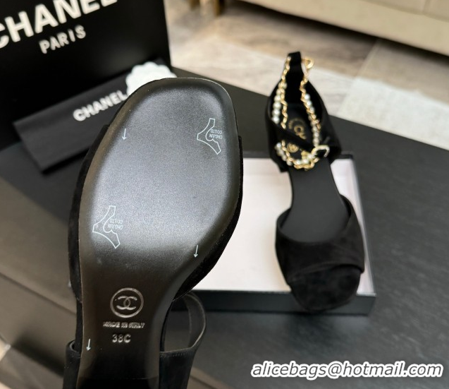 Shop Duplicate Chanel Suede Low Heel Sandals with Chain and Pearls Black 2025 G46658