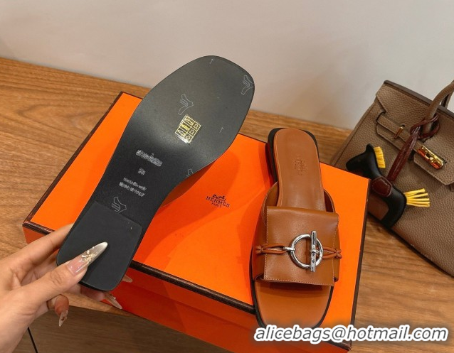 Charming Hermes Flat Slides Sandal in Calfskin Leather with Buckle Brown 2026 HS030401
