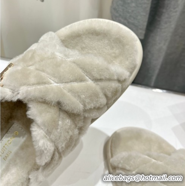 Shop Duplicate Louis Vuitton LV Bliss Comfort Shearling Flat Slides Sandal Grey 1ACTEA 0829113