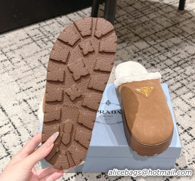 Luxury Discount Prada Suede and Shearling Platform Mules 4cm Brown2 2025 PR102702 1027025