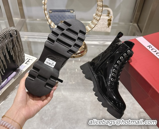 Sophisticated Roger Vivier Viv' Rangers Truck Ankle Boots 5cm in Shiny Leather with Strass Buckle Black 1030066