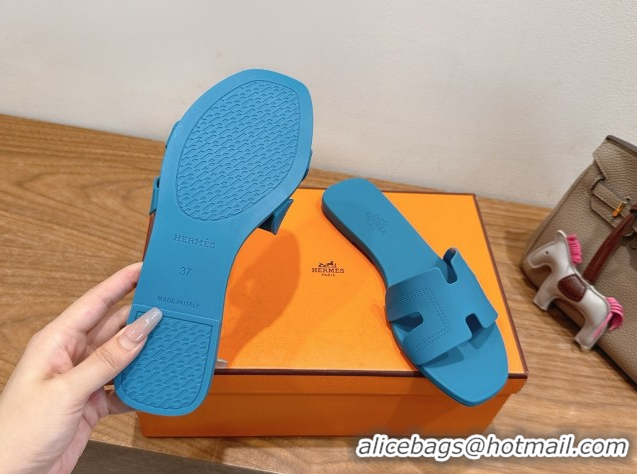 Shop Hermes Oran Classic Flat Slides Sandal in Stitching Rubber Blue 0820192