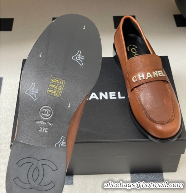 Classic Hot Chanel Calfskin Leather Loafers with Letters Strap Brown2 2025 CH103102 1031099
