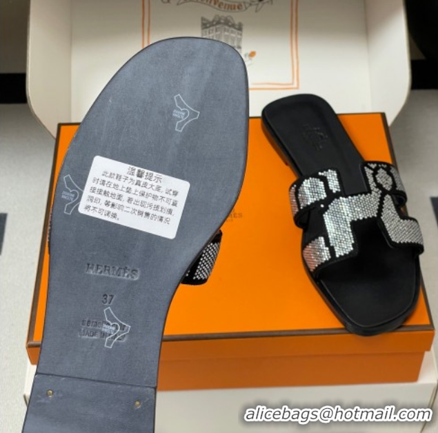 1:1 aaaaa Hermes Classic Oran Flat Slides Sandal in Suede and Strass Black/Silver 1023105