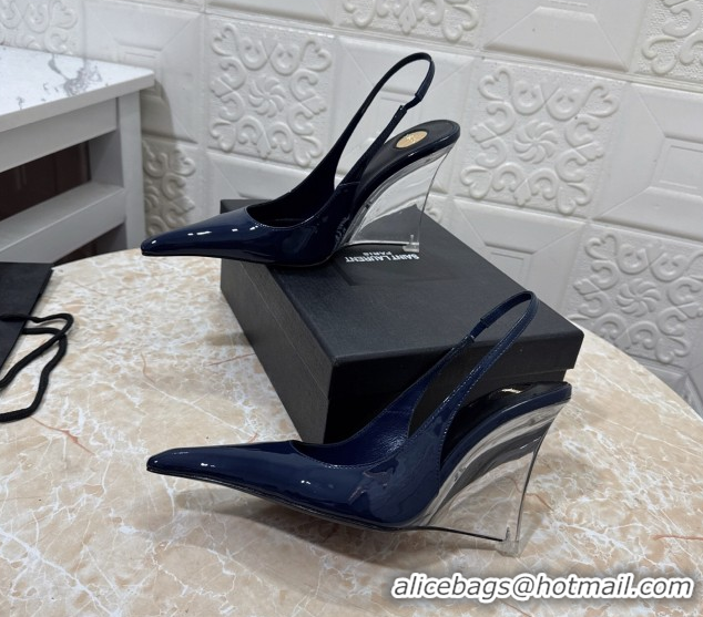 Best Price Saint Laurent Pointy Slingback Wedge Pumps 10.5cm in Patent Leather Blue 1028089