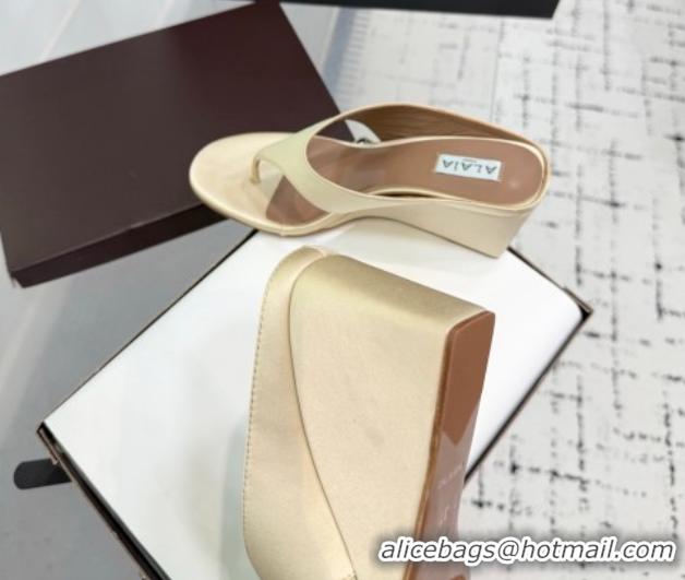 Stylish Alaia Cube Wedge Thong Slides Sandal 7.5cm in Satin Light Beige 50709006
