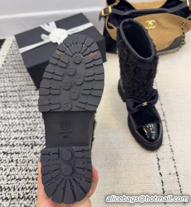 Stylish Chanel Fur, Lambskin & Patent Leather Platform Ankle Boots Black 2025 G46636 1103147