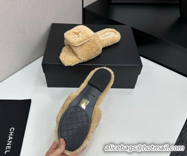 Pretty Style Chanel Shearling Wool Flat Slides Sandal with Foldover Beige 2025 CH103106 1031126