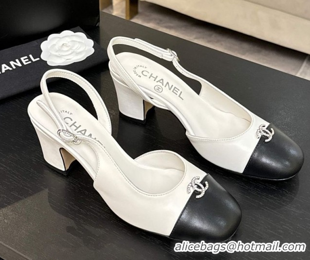 Low Cost Chanel Lambskin and Calfskin Leather Slingback Pumps 6.5cm with Strass CC White CH110301
