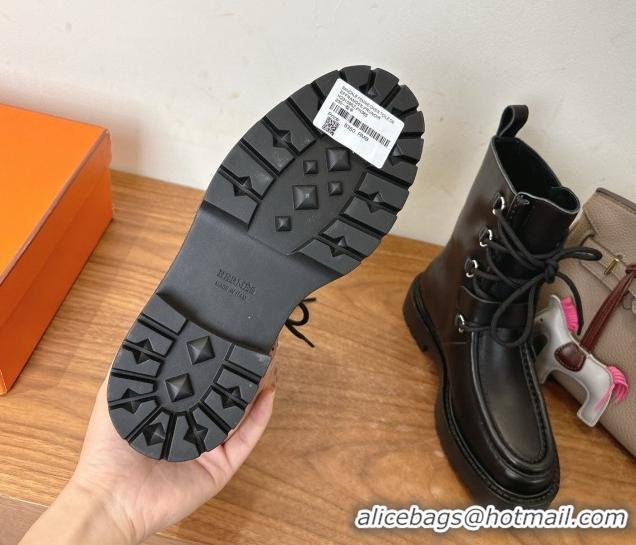 Sophisticated Hermes Land Biker Laced-up Ankle Boots in Calfskin Leather with Buckle Strap Black 1023043