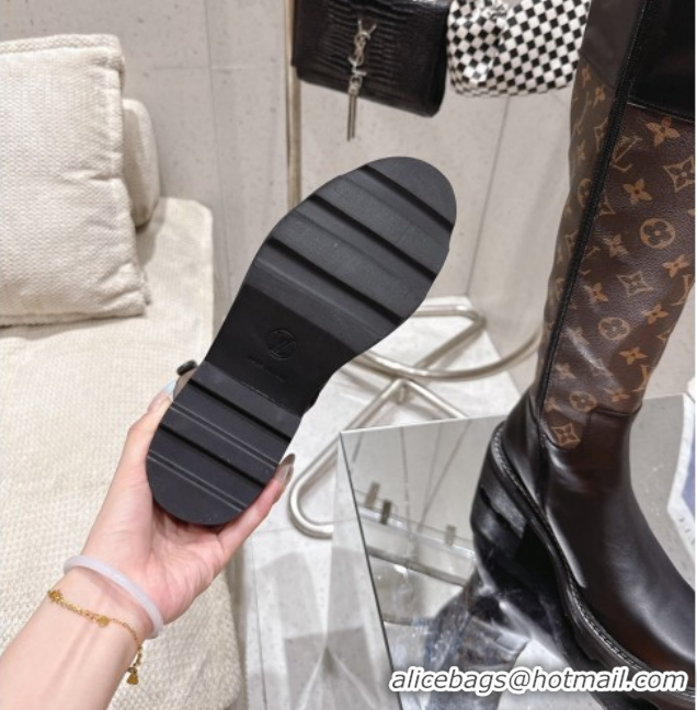 Luxury Cheap Louis Vuitton Monogram Canvas and Leather High Boots 3.5cm with Buckle Black/Brown LV102202 1022014