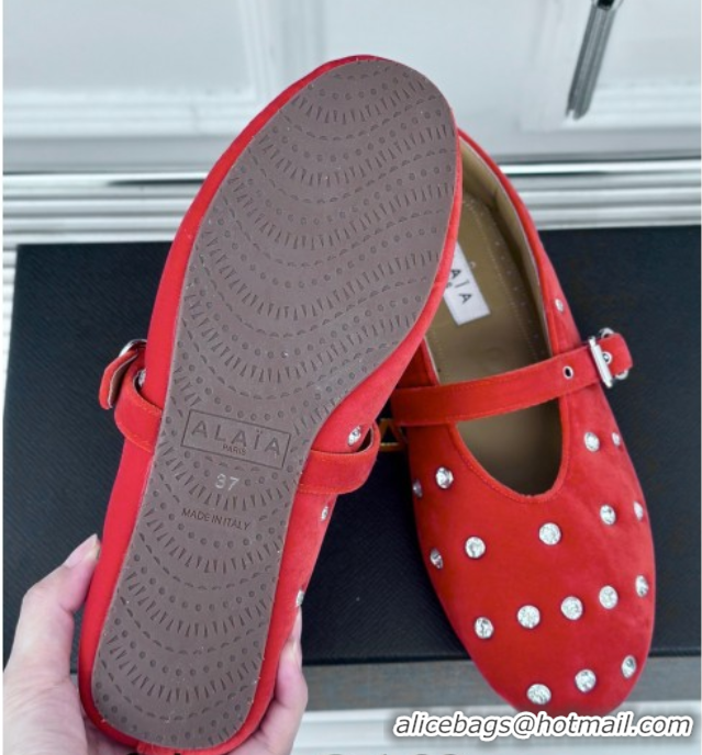 Sumptuous Alaia Ballet Flats in Puffer Velvet with Strass Red 1112015