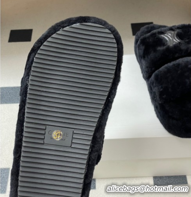 Sumptuous Celine Triomphe Wool Platform Slides Sandal Black 2025 CE102407 1024073