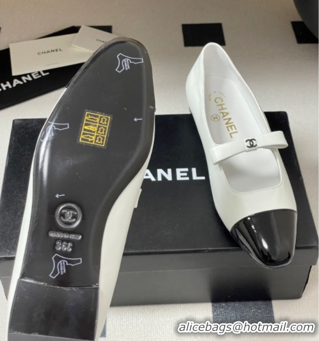 Chanel Lambskin and Patent Leather Mary Janes Ballet Flats with Bow White 2025 CH110302 1103067