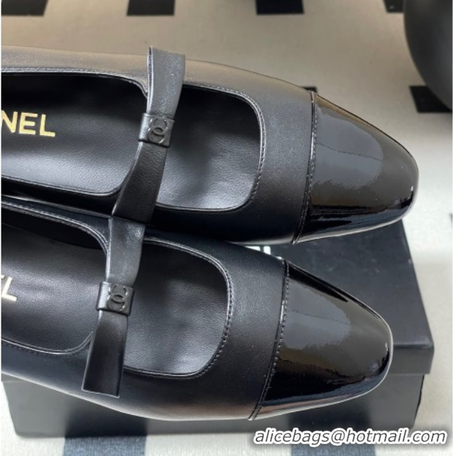 Luxurious Chanel Lambskin and Patent Leather Mary Janes Ballet Flats with Bow Black 2025 CH110302 1103066