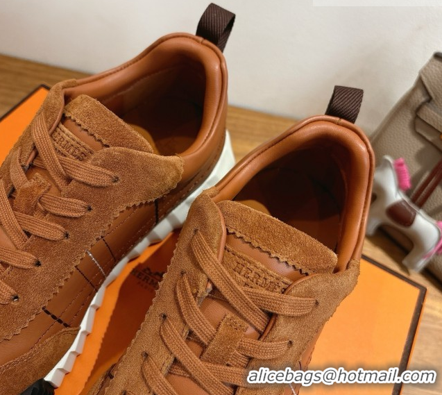 Duplicate Hermes Bouncing Sneakers in Embroidered Leather and Suede Tan Brown 1222044 2026