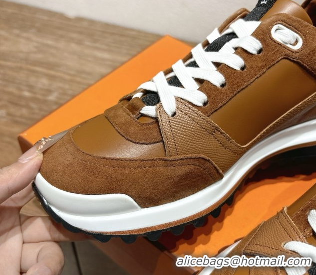 Top Grade Hermes Leader Sneakers in Suede and Calfskin Leather Tan Brown 1023037