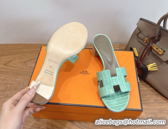 Stylish Hermes Oasis Classic Heel Slides Sandal 4.5cm in Crocodile Embossed Leather Light Green 0304048