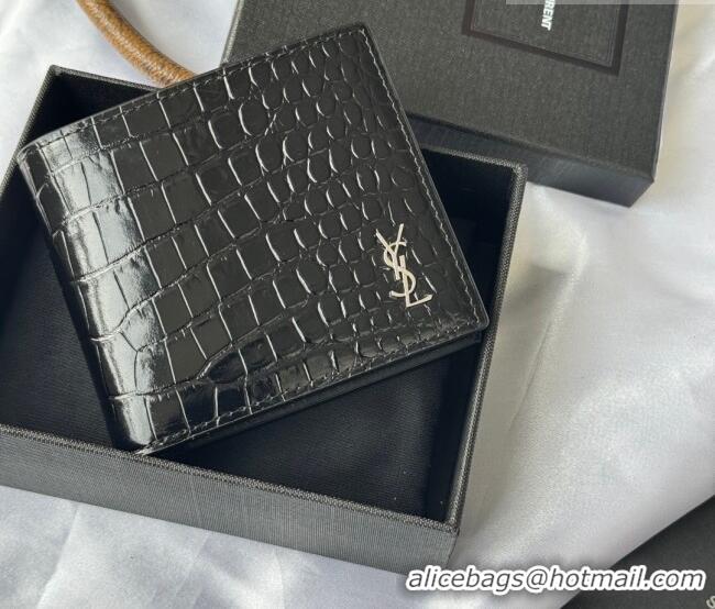 Luxury Cheap Saint Laurent Men's Tiny Cassandre Eastwest Wallet in Crocodile Embossed Leather 607727 Black/Silver 2026