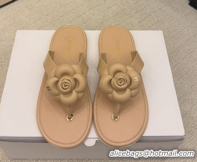 Sophisticated Chanel Calfskin Leather Flat Thongs Slide Sandal with Camellia Bloom G46988 Beige 2026