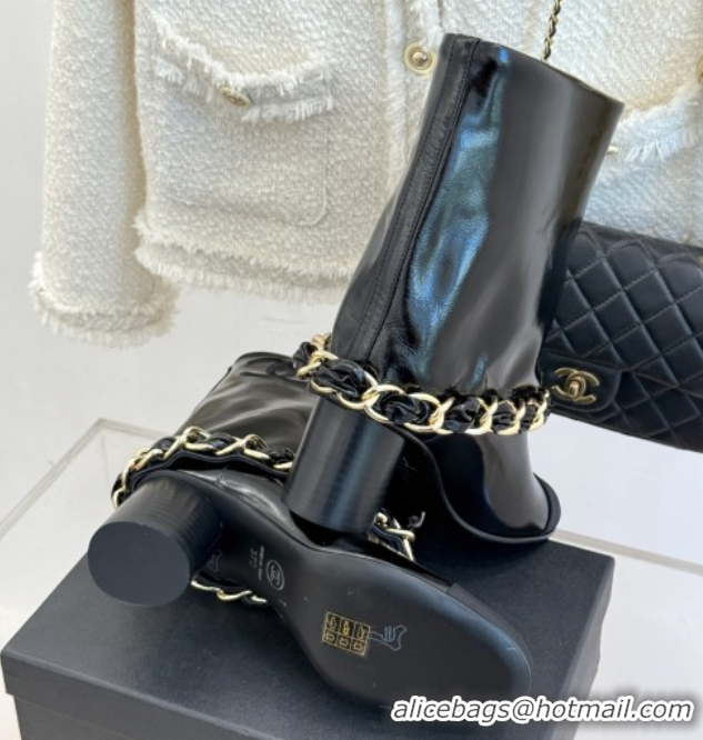Good Product Chanel Patent Leather & Grosgrain Boots with Chain 5cm Heel Black 101414