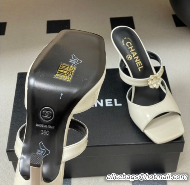 Purchase Chanel Patent Calfskin Leather Heel Slides Sandal 7.5cm with Camellia CH030613 White 2026