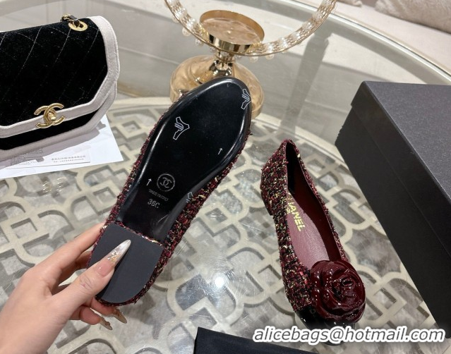 Stylish Chanel Tweed & Patent Leather Ballet Flats with Camellia Bloom CH030704 Burgundy 2026