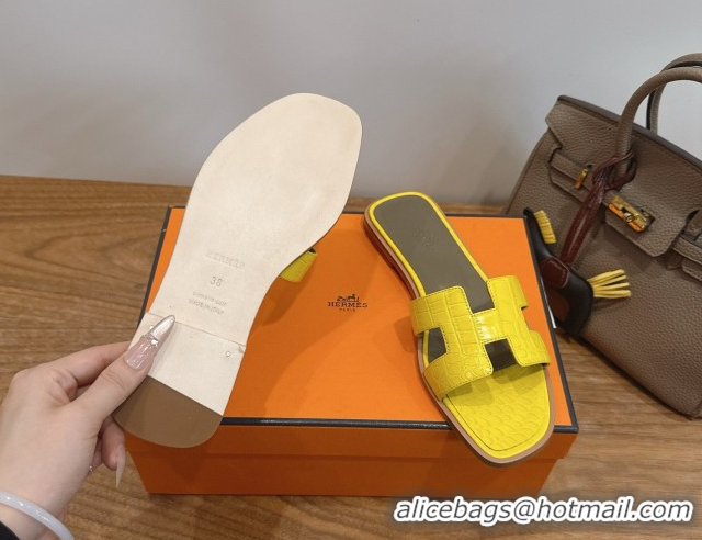 Top Design Hermes Oran Classic Flat Slides Sandal in Crocodile Embossed Leather Yellow 0304059