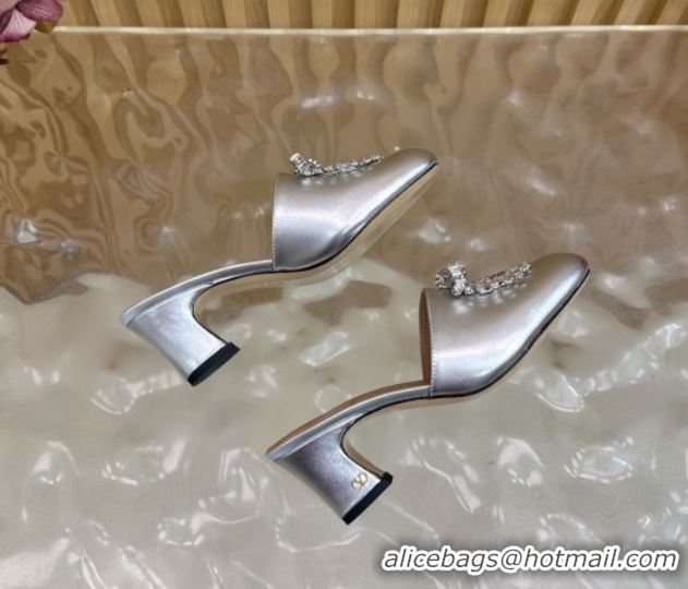 Shop Duplicate Valentino Strass Embellished Heel Mules 5.5cm in Calfskin Leather Silver VLTN121509 51215118