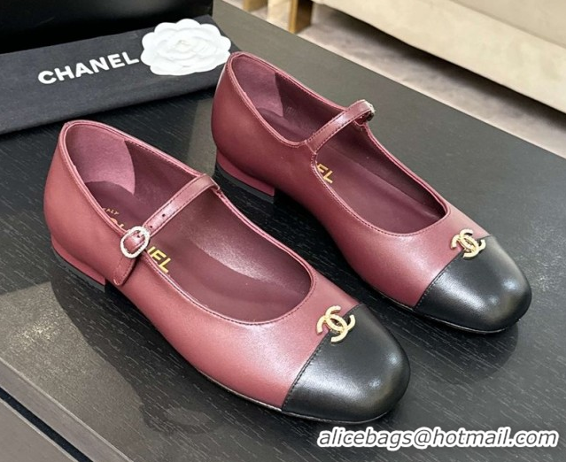 Good Quality Chanel Lambskin and Calfskin Leather Mary Janes Ballets Flat with Strass CC Burgundy 2025 CH110301