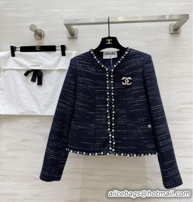 Top Grade Chanel Tweed Jacket with Pearls CH91312 Blue 2025