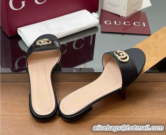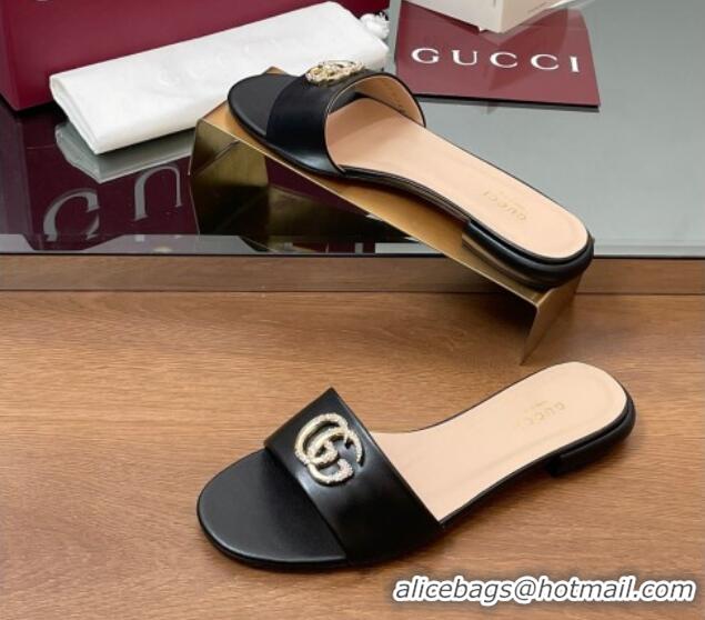 Pretty Style Gucci Leather Flat Slides Sandal with Strass Double G Black 2025 GG042301