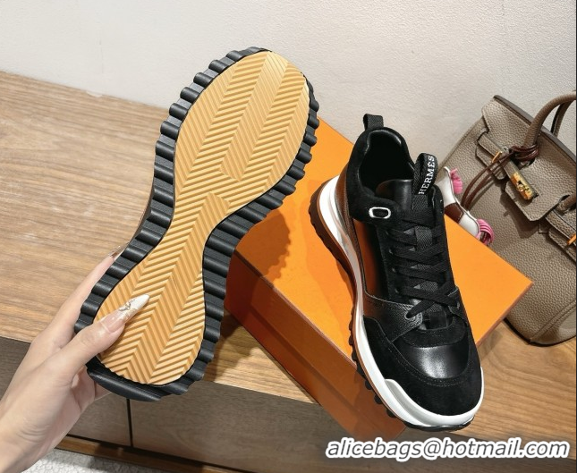 Stylish Hermes Leader Sneakers in Suede and Calfskin Leather Black 1023036
