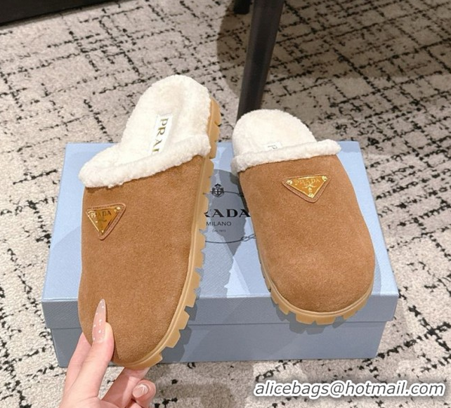 Top Grade Prada Suede and Shearling Flat Mules Brown2 2025 PR102702 1027031